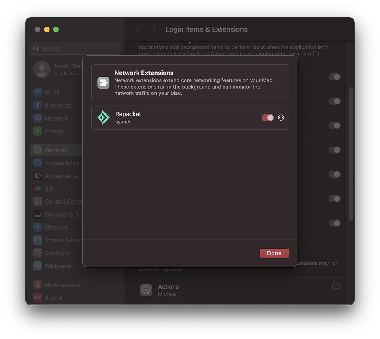 Repacket uses a MacOS network extension on MacOS to handle routing traffic to our agent.Click the “Open System Settings” prompt to enable our network extension.