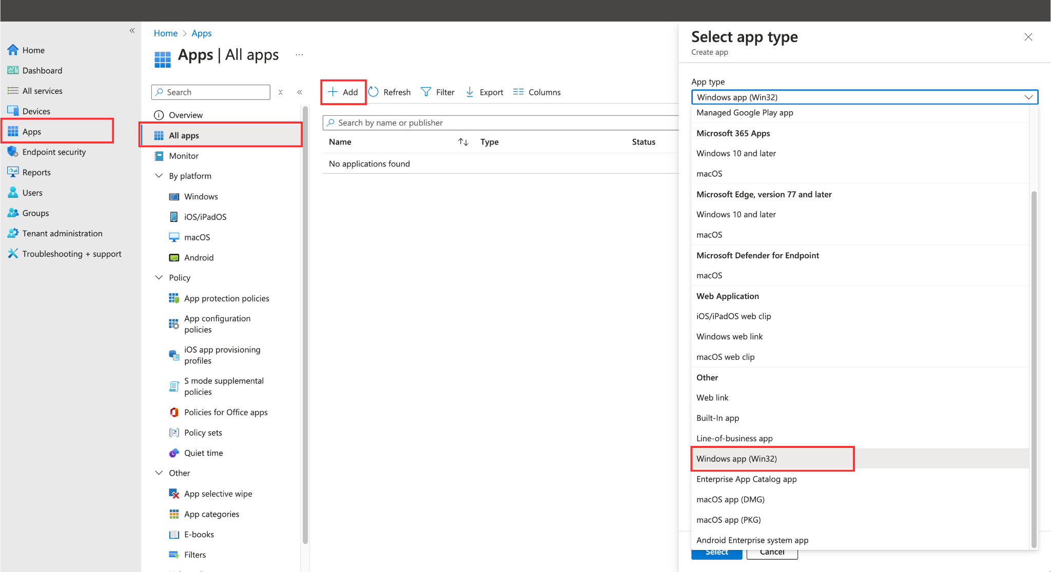 Login to your Intune dashboard, and navigate to Apps > All AppsClick the Add button at the top of this table to open the new app creation prompt.Select Windows app (Win32) from the Other section of the dropdown on your right.