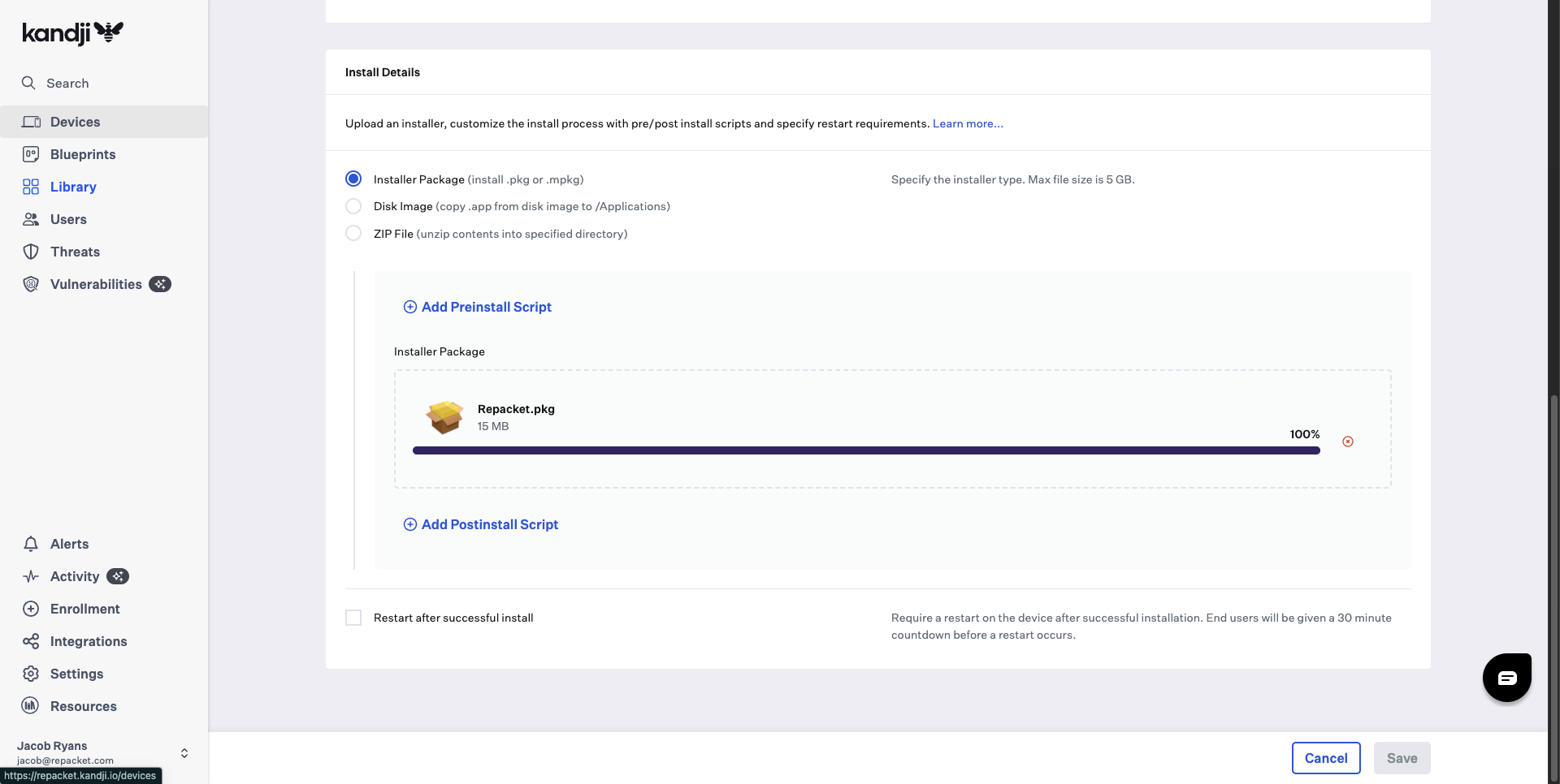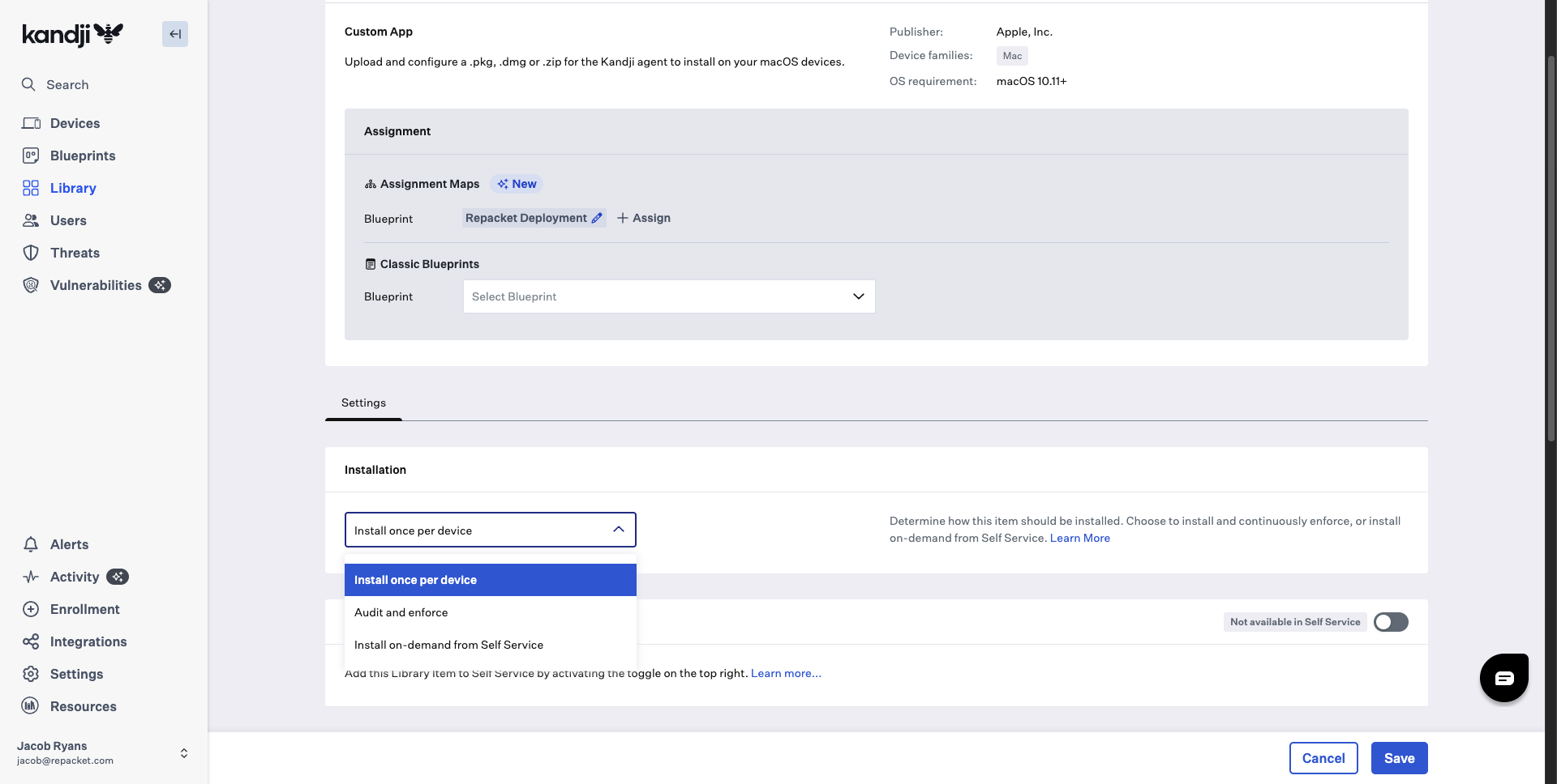 Audit and enforce if you want Kandji to ensure Repacket stays installed. - (Optional) Toggle Self Service if you would like users to install on-demand.