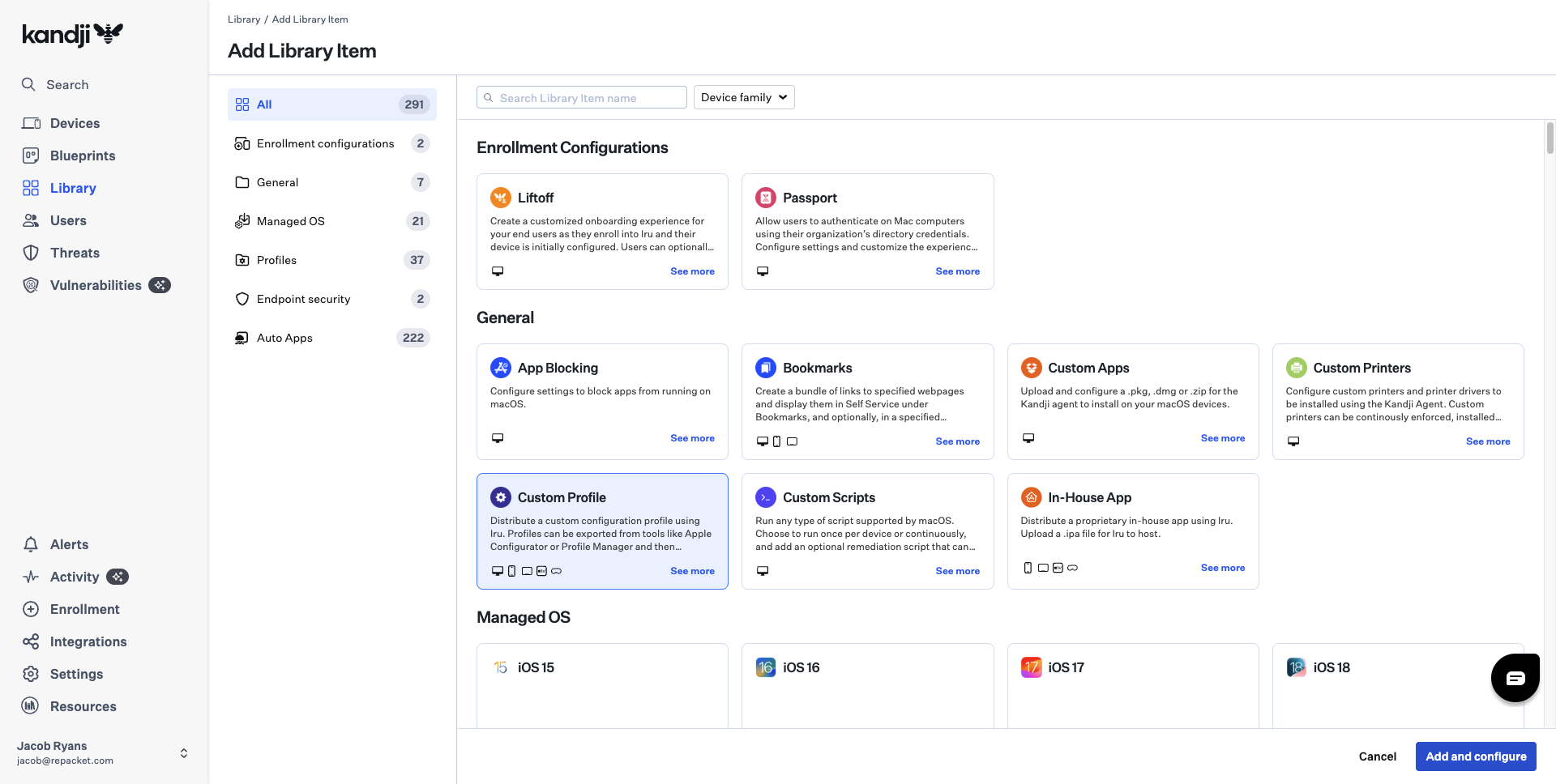 + Add Library Item.Under the General section, select Custom Profile and click Add and configure.