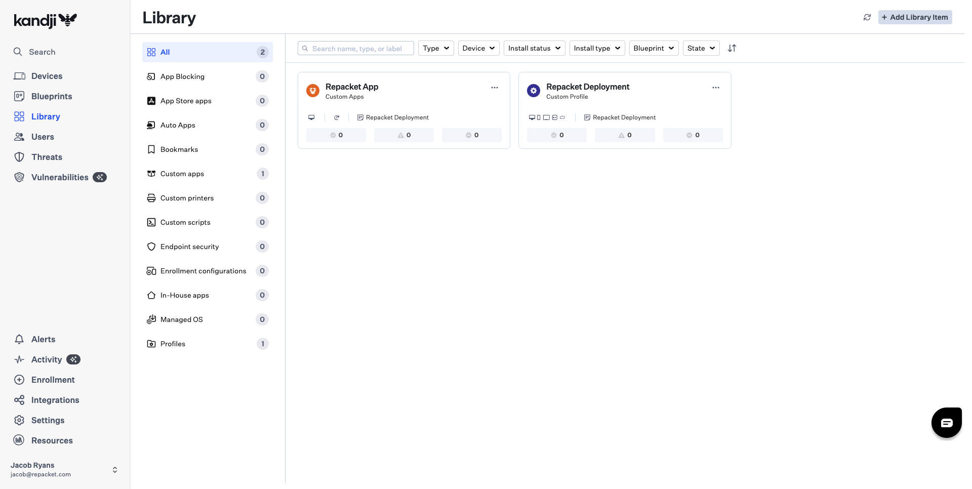 - Custom App Deployment – a Kandji Custom App that installs the Repacket macOS app on your endpoints.