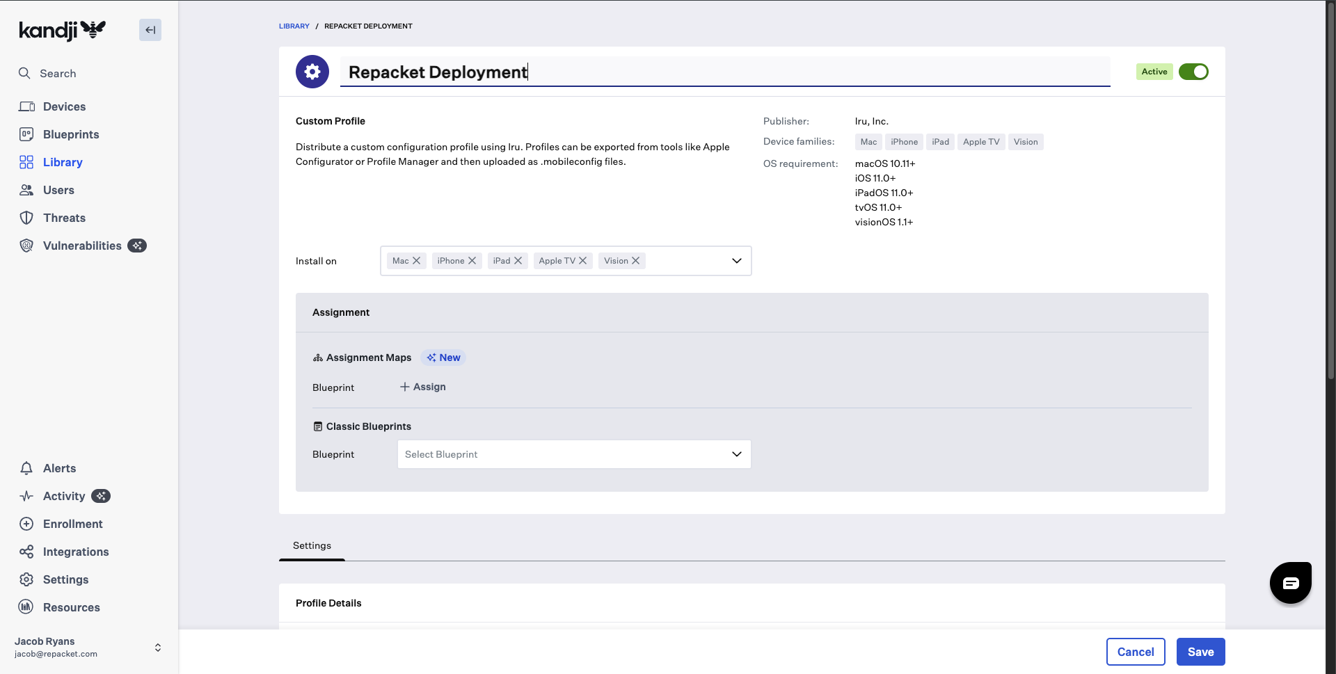 - Devices in the scoped Blueprints will first receive the Repacket profile (certificate, system extension, VPN, and privacy permissions).